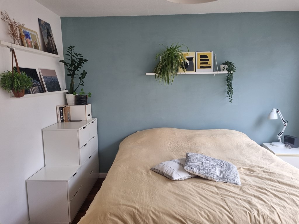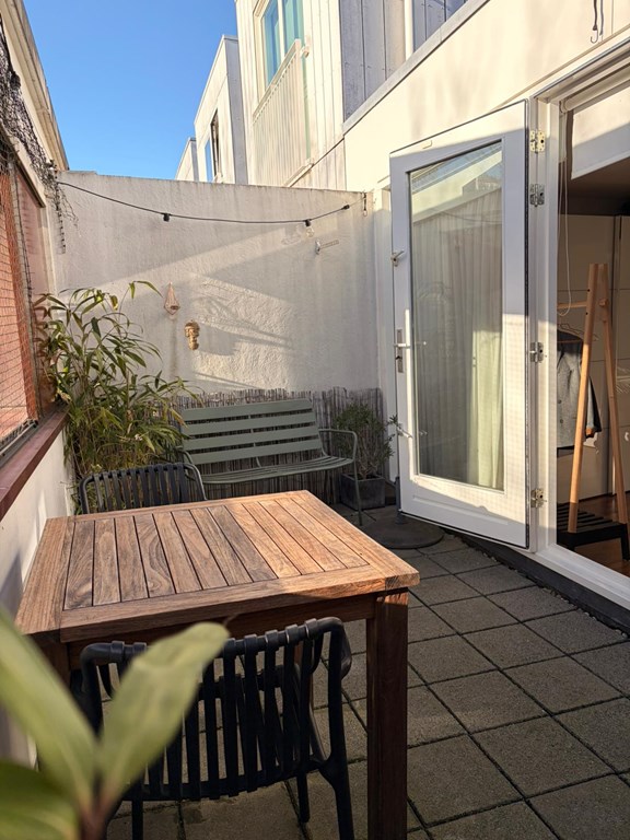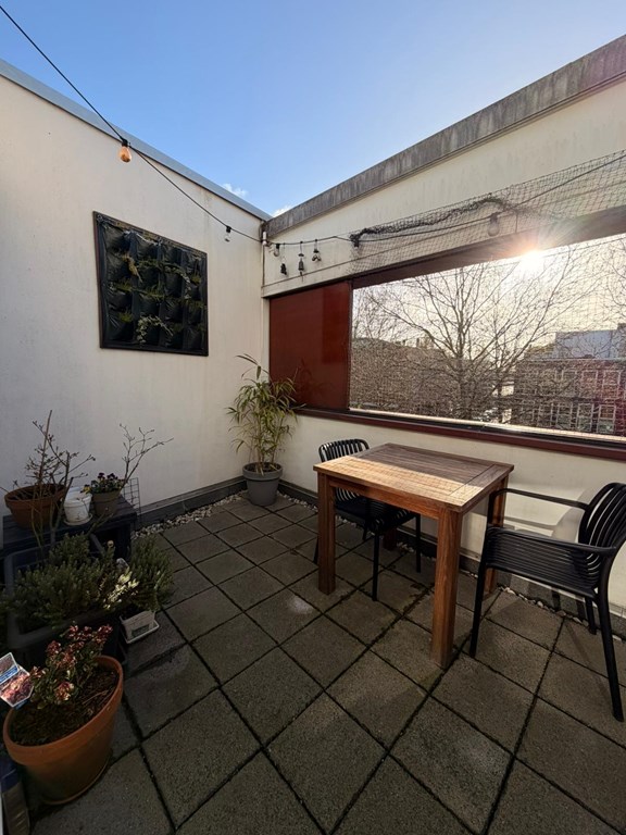 Upstairs, the spacious bedroom provides a calm and private retreat. It benefits from a large wardrobe and direct access to a lovely terrace—complete with plants and soft fairy lighting—creating a tranquil outdoor space to unwind.