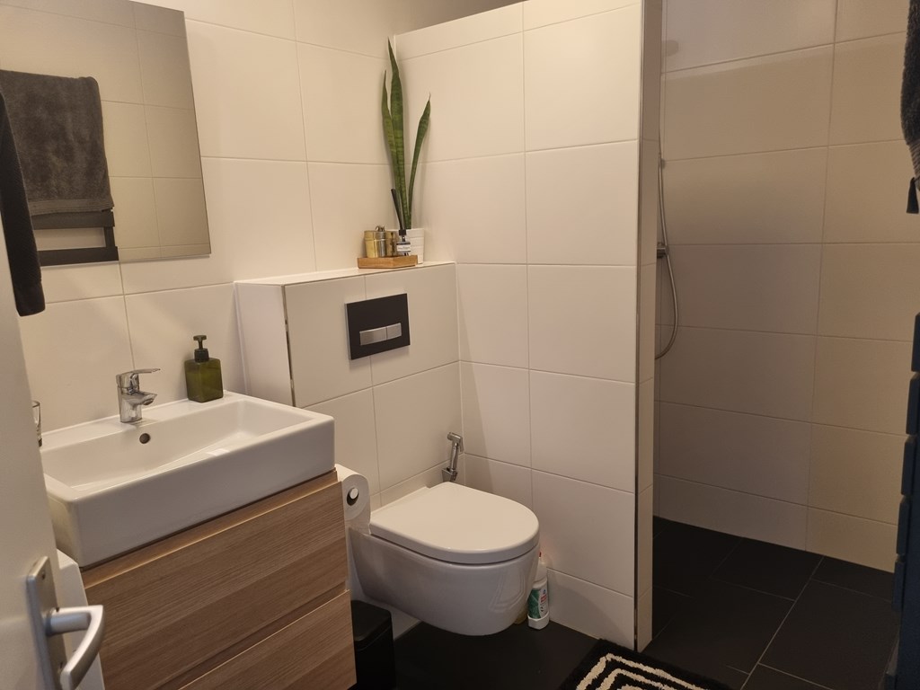 The bathroom is modern and elegantly designed, featuring a large walk-in shower, toilet, and wash basin with built-in storage, all finished with clean white tiling for a fresh and timeless look.