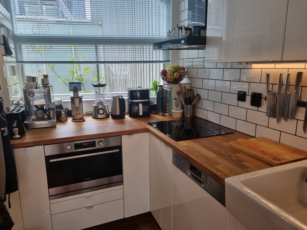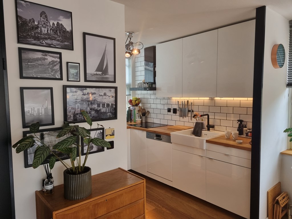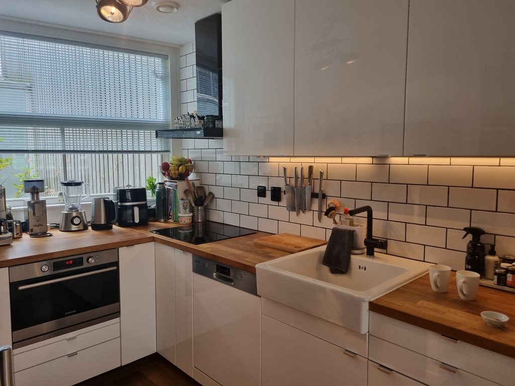 The apartment features a generous, contemporary kitchen that is both practical and beautifully finished. It includes a striking subway tile backsplash, warm wooden worktops, a large basin sink, induction hob, oven/microwave, and an abundance of cabinetry, offering excellent storage and functionality.